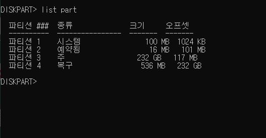 (실제 링크에서는 diskpart 실행 ?? 처음 접하는 저도 말 뜻이 이해가 바로 안되었지만 대충 눈치로 '입력'이라고 생각했습니다)