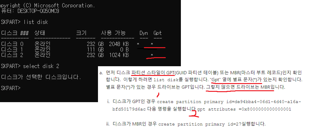 디스크 스타일을 확인후 해당하는 경우의 명령어를 입력합니다.